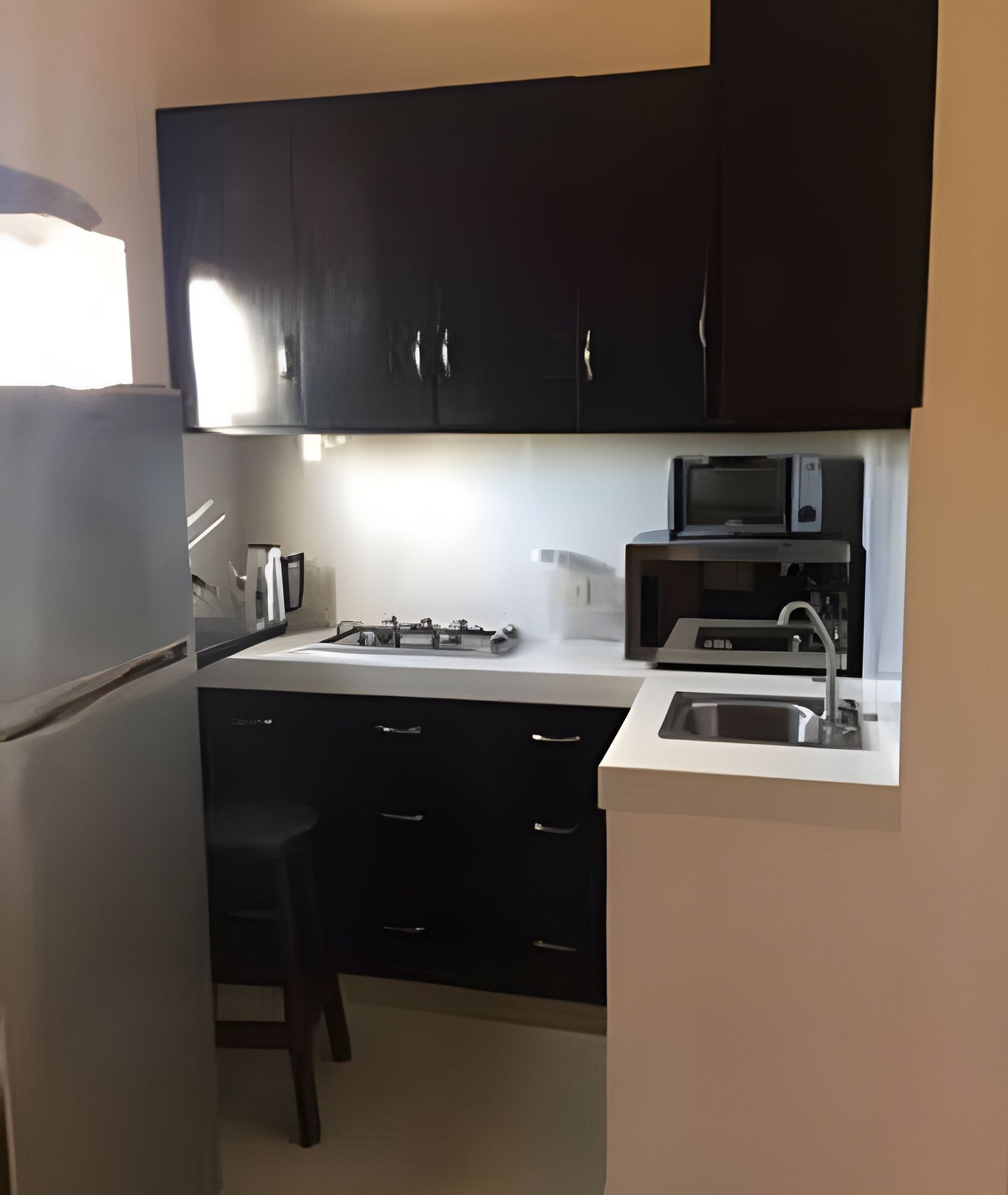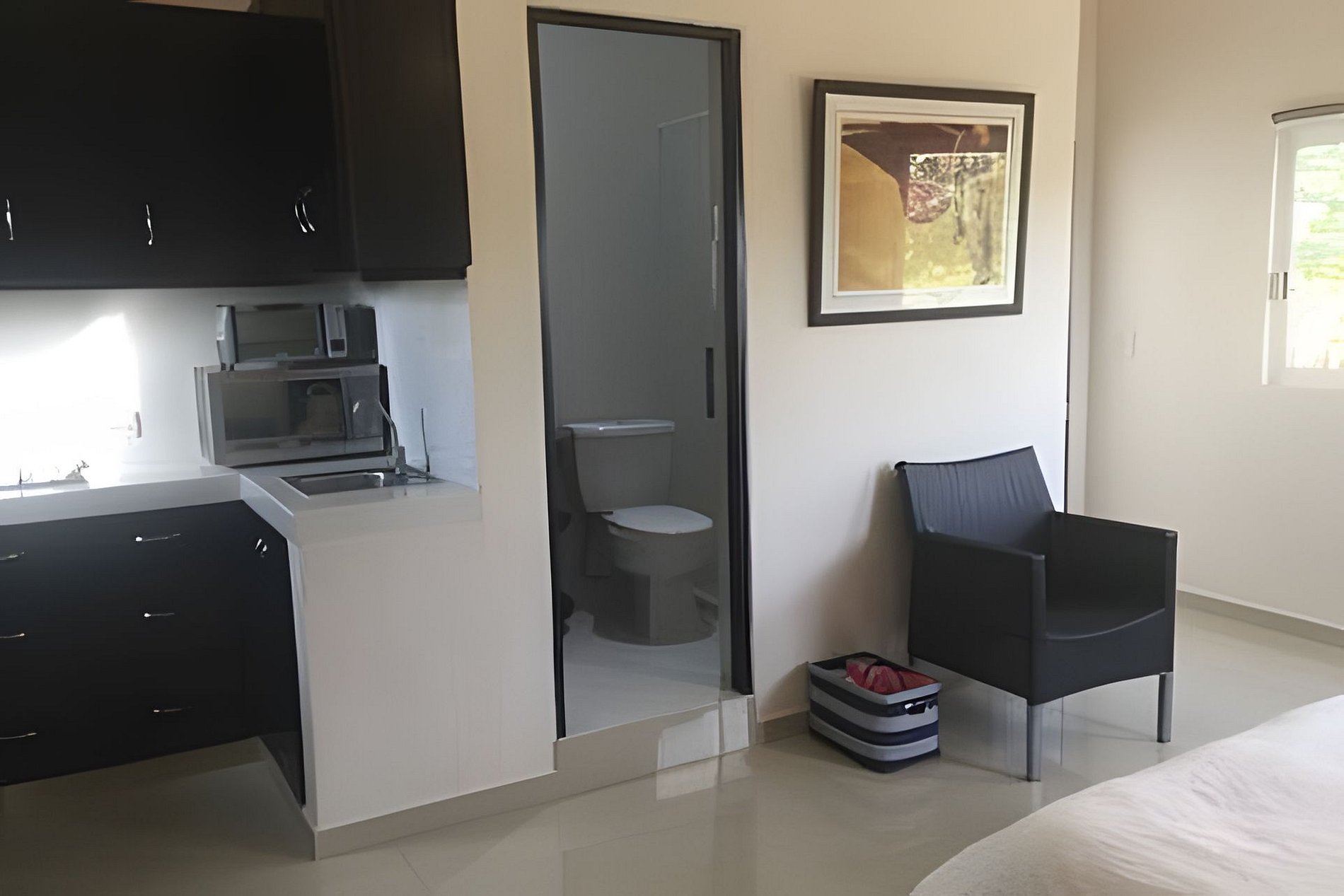Estudios en Cabo San Lucas cerca del centro, la playa y la vida nocturna. Cuentan con baño privado y cocina equipada, con ollas, sartenes y demás artículos esenciales para cocinar.